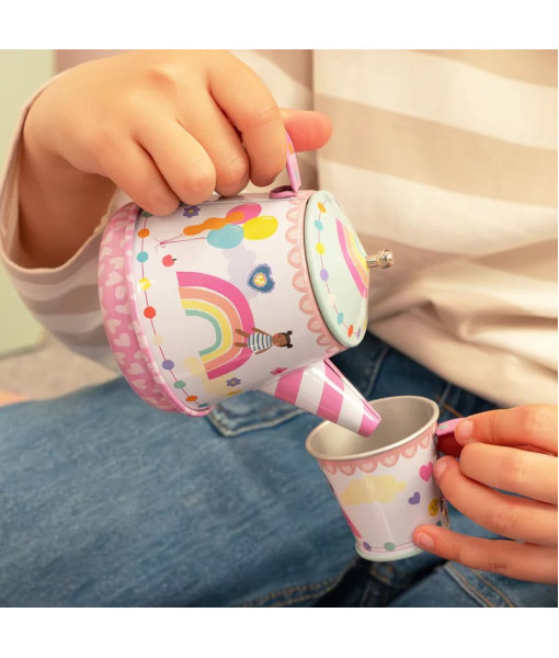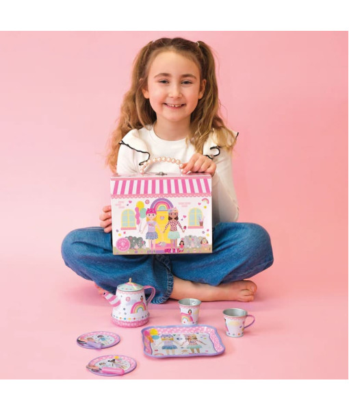 Το όμορφο μουσικό σετ τσαγιού 9 τεμαχίων "Οι καλύτεροι φίλοι" περιλαμβάνει τσαγιέρα και καπάκι, 2 φλιτζάνια τσαγιού, 2 πιάτα και 1 δίσκο σε μια υπέροχη επαναχρησιμοποιούμενη θήκη μεταφοράς με όμορφη λαβή από μαργαριτάρι, ιδανική για να την παίρνετε μαζί σας σε πάρτι τσαγιού με φίλους! Γυρίστε το ρολό κάτω από την τσαγιέρα και ρίξτε νερό για να ακούσετε το τραγούδι "Είναι ένας μικρός κόσμος"!