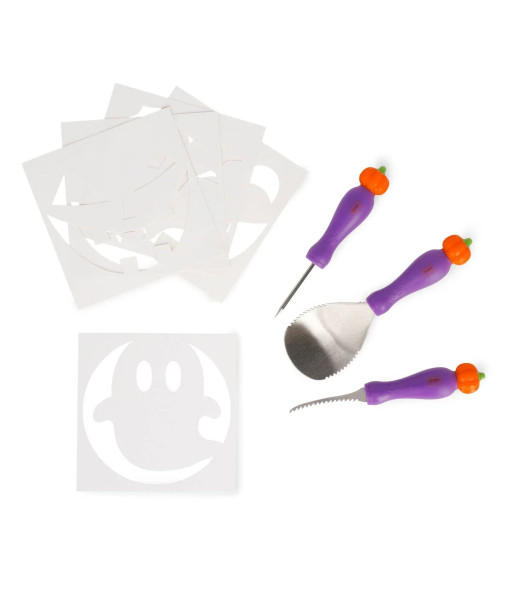 Μια συμβουλή για να χαμογελάσετε: για να πετύχετε ένα πραγματικά επαγγελματικό αποτέλεσμα με απόλυτη ασφάλεια, χρειάζεστε το Κιτ Σκαλίσματος Κολοκύθας Halloween - Carve & Scare από τη Legami! Τα εργαλεία σας; 1 μαχαίρι με πριονωτή λεπίδα, 1 κουτάλα με οδοντωτή άκρη, 1 σουβλί για ξύσιμο και 5 στένσιλ για να διακοσμήσετε με πραγματικά πρωτότυπο στυλ. Θα είστε ο Βασιλιάς της αντλίας σκαλίσματος!