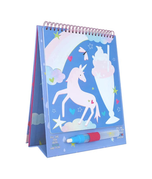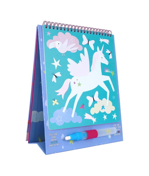 Τα Μαγικά Καβαλέτα Νερού μας είναι τόσο διασκεδαστικά! Όπως και οι δημοφιλείς κάρτες νερού μας, γεμίστε το στυλό με νερό και χρωματίστε τα σχέδια για να τα δείτε μαγικά να εμφανίζονται και να εξαφανίζονται μόλις στεγνώσουν. Τα 6 φωτεινά χρωματιστά φύλλα διασκέδασης συγκρατούνται σε ένα σπειροειδές μαξιλαράκι, επιτρέποντάς σας να τα αναποδογυρίσετε μόλις ολοκληρωθεί. Το ενσωματωμένο καβαλέτο στηρίζει το μαξιλαράκι, ώστε να μπορείτε να το χρησιμοποιείτε σαν «κανονικός» καλλιτέχνης! Το μαξιλαράκι είναι επαναχρησιμοποιήσιμο ξανά και ξανά και θα διασκεδάσετε πολύ αποκαλύπτοντας τα πολύχρωμα ουράνια τόξα, τις νεράιδες, τους μονόκερους και τα ζώα! Μόλις ολοκληρώσετε τη δημιουργική σας συνεδρία, κλείστε το μαξιλαράκι και ασφαλίστε το ειδικό στυλό νερού σας στο ελαστικό κλείσιμο για να το διατηρήσετε ωραίο και ασφαλές. Αυτό το φορητό μαξιλαράκι είναι ιδανικό για να το παίρνετε έξω (και δεν χρειάζεται να ανησυχείτε για τυχόν ακαταστασία!).