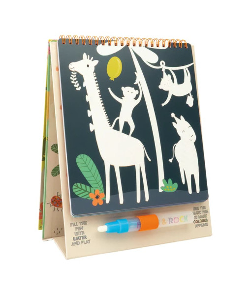 Τα Μαγικά Καβαλέτα Νερού μας είναι τόσο διασκεδαστικά! Όπως και οι δημοφιλείς κάρτες νερού μας, γεμίστε το στυλό με νερό και χρωματίστε τα σχέδια για να τα δείτε μαγικά να εμφανίζονται και να εξαφανίζονται μόλις στεγνώσουν. Τα 6 φωτεινά χρωματιστά φύλλα διασκέδασης συγκρατούνται σε ένα σπειροειδές μαξιλαράκι, επιτρέποντάς σας να τα γυρίσετε από την άλλη πλευρά μόλις ολοκληρωθούν. Το ενσωματωμένο καβαλέτο στηρίζει το μαξιλαράκι, ώστε να μπορείτε να το χρησιμοποιείτε σαν «κανονικός» καλλιτέχνης! Το μαξιλαράκι είναι επαναχρησιμοποιήσιμο ξανά και ξανά και θα διασκεδάσετε πολύ αποκαλύπτοντας τους πολύχρωμους και σούπερ διασκεδαστικούς φίλους της ζούγκλας! Μόλις ολοκληρώσετε τη δημιουργική σας συνεδρία, κλείστε το μαξιλαράκι και ασφαλίστε το ειδικό στυλό νερού σας στο ελαστικό κλείσιμο για να το διατηρήσετε ωραίο και ασφαλές. Αυτό το φορητό μαξιλαράκι είναι ιδανικό για να το παίρνετε έξω (και δεν χρειάζεται να ανησυχείτε για τυχόν ακαταστασία!).