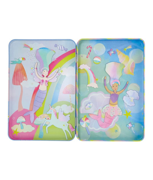 Διασκεδαστικό παιχνίδι σε ένα πρακτικό μαγνητικό κουτί! Περιέχει 3 φύλλα με μαγνήτες που αποσπώνται, ώστε να διασκεδάσετε κολλώντας πάνω από 50 φωτεινά, χαρούμενα μαγνητικά κομμάτια στις 2 διασκεδαστικές σκηνές στο εσωτερικό του κουτιού και να αφήσετε τη φαντασία σας ελεύθερη, δημιουργώντας υπέροχες εικόνες με γοργόνες, μονόκερους, φιλικά ψάρια και πολλά ακόμη. Ένα ιδανικό μικρό δώρο, τυπωμένο με μελάνια σόγιας και κατασκευασμένο από ανακυκλωμένα υλικά. Όταν τελειώσετε το παιχνίδι, το μαγνητικό κουτί αποθηκεύει με ασφάλεια όλα τα κομμάτια, έτοιμα για την επόμενη φορά.